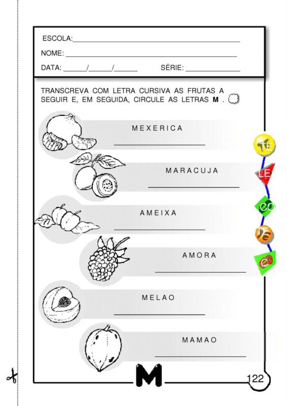 Transcreva com letra cursiva as frutas a seguir e, em seguida, circule as letras M