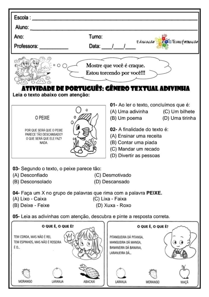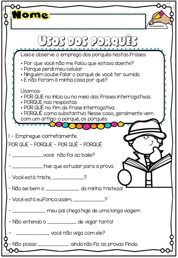 As atividades de Português para imprimir são ferramentas essenciais para o desenvolvimento da leitura, escrita, interpretação e gramática, tanto na educação infantil quanto no ensino fundamental. Professores, pais e educadores utilizam esse recurso para reforçar conteúdos trabalhados em sala de aula, promover a alfabetização e estimular o gosto pela língua portuguesa de forma prática e acessível.